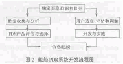 PDM系统的实施通常有:组建队伍; 需求分析;软件选型;系统设计(硬件、软件选择,职能部门地位任务,人员分工权限等) ;详细设计(人员、产品和工作三类模型,目标实现途径,输入/ 输出要求等) ;二次开发(利用开发工具,进行客户化定制) ;安装与设置(第一次安装是在需求分析阶段、为用户设置一个PDM 系统的基本软件环境。主要目的在于开展需求分析;第二次安装是在二次开发结束后,对硬件和软件的安装调试) ;人员培训(前期培训,后期培训) ;试运行(在初始阶段以某一个产品为试点,与原来的管理体系平行开展工作,在取得经验后,再推广到一个系列的产品,乃至整个企业的全部产品信息的管理。一旦技术成熟,取得经验以后,才能用PDM系统来取代原来的管理系统) 。图2 为舰船PDM系统开发流程图。
