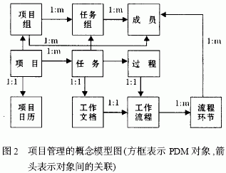 项目管理是一种为了在确定的时间范围内,完成一个既定的项目,通过一定的方式合理地组织有关人员,并有效地管理项目中的所有资源(人员、设备等) 与数据,控制项目进度的系统管理方法。为了实施一个项目,需要执行项目规划、制定进度计划、过程监视和分析等步骤。作为PDM 系统的项目管理模块,它主要是围绕企业产品的开发设计来组织项目的。一个项目往往需要分解成几个任务,而一个具体的任务又由它包含的若干个工作文档来确定。项目对象需要利用任务对象和工作文档对象来确定项目的结构。为了项目的顺利进行必须组织开发团队进行协同工作,因此一个项目还应该有项目组、项目负责人、项目成员等对象。项目、任务、工作文档对象可以与一个项目日历对象相关联,以便进行项目的实际进度和目标进度的比较。