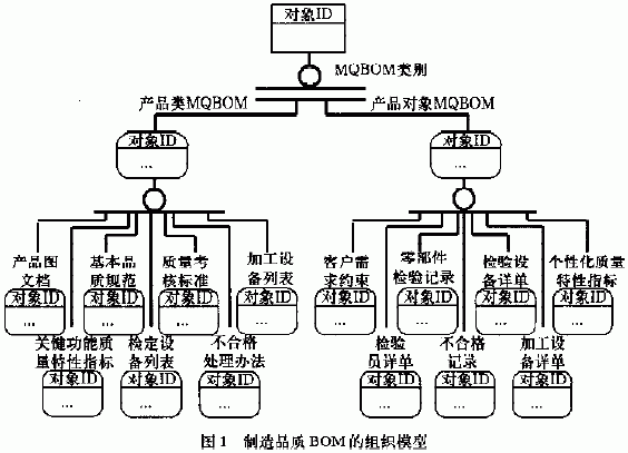 BOM(Bill of Materials),物料清单,也被称为产品结构表或产品结构BOM 树,是一种典型的树状结构。物料一词在企业中有着广泛的含义,它是所有产品、半成品、在制品、原材料、装配件、协作件、易耗品等与生产有关物料的统称。产品BOM描述的是产品结构和配置,在继承产品BOM 的基础上,对产品组成中的自制件增加静态制造质量信息,如质检设备资料、质检品质规范、产品检测规程等,以及在生产过程中所生成的动态制造质量信息,如现场采集的质量检验数据、质检人员对工序是否合格的判断数据、故障发生数据等形成的新的BOM 形式,即为制造品质BOM,本文提出的制造品质BOM具有面向产品的特性,体现在以下方面: