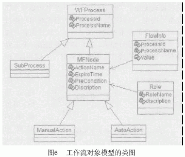 根据WFMC的过程定义元模型(basic process definition meta-model),一个工作流过程(WFProcess)由若干个活动(Activity)组成。活动定义着工作流的执行步骤,活动又可以分成子过程(SubProcess)和一般活动(MFNode,不能再分子过程的原子级活动)两种类型。一般活动可以分为自动执行的活动(ManualAction)和人工型的活动(AutoAction)。顾名思义,AutoAction是工作流管理系统自动调用相关服务而执行的活动,ManualAction则是需要用户操作执行的活动。FlowInfo 类用于表示各个活动执行时用到的相关数据,它将随着活动实例的执行而在活动实例之间传递数据。工作流定义的时候需要指明活动执行者的角色信息,以获得对各个活动执行权限的控制,所以定义了角色类Role。经过以上对过程定义的分析,可以得到工作流对象模型的类图框架如图6 所示。