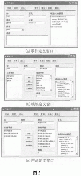 图5 是在PDM系统基础上做的二次开发的一些界面。其中图5(a)所示是零件定义窗口,在零件定义窗口中可以定义零件的一些基本属性,如零件的ID 号,描述,材质,颜色等,同时系统将会自动将这些定义值转换为动态BOM的描述方式。图5(b)所示是模块定义窗口,在模块定义窗口中定义模块的组成方式,首先定义模块的一些基本属性,然后再定义模块的组成,在窗口的左边显示的是已经选择的零件,右边显示的是可选的零件。可以通过添加或删除的方式来添加删除零件。图5(c)是产品定制窗口,在这个窗口中可以选择各个模块来组成产品。通常由于模块的可选或必选在事先已进行设定,因此有一些模块必须选择,否则系统将提示用户不能将该产品结构存入产品库。