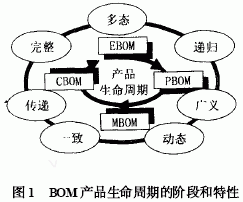BOM 是一种描述所制造产品的条目、成分或物料组成的“清单”文件,相当于明细一览表。如结构物料清单和数量一览清单等。其产品生命周期和特性如图1 所示。