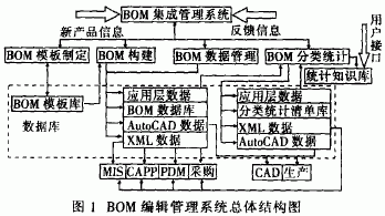 为了解决以上问题,结合某机械企业的信息化项目,本文提出了一种基于统计知识库的BOM集成管理系统(BOM IntegratedManagement System, BOM_ IMS) 。该系统集BOM结构定义、数据输入、管理与分类统计等多种功能于一身, 并针对CAD,CAPP及MIS等系统提供了数据接口,为企业产品数据管理提供了一个公共应用平台。