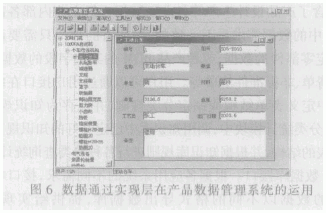 图6为数据在产品数据管理系统中的运用实例。一方面形成了左边的产品结构树;另一方面选择零部件节点,出现其对应的产品信息。