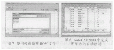 在开发过程中,笔者遵循标准化要求实现操作界面方便友好,并提供了强大的在线帮助功能。此外,系统经过反复调试和实际运用,具有很好的稳定性和容错性。图7为使用已有的模板来构建BOM文件。图8为在AutoCAD 2000中自动绘表程序通过调用数据库中BOM数据绘制出产品明细表。限于篇幅,其余的操作界面和运行情况从略。