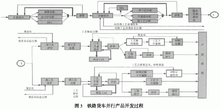 改进后的铁路货车开发过程(并行) 如图3 所示。铁路货车开发过程在设计的早期阶段,就能够充分考虑冲压件、铸钢件等类零件的可制造性问题和铁路货车的结构强度、刚度及动力学品质等产品性能问题,从而能够尽量减少设计错误,提高设计质量。同时增加DFx ,使得在产品设计阶段即可考虑产品加工、装配和工艺等问题,提高一次设计成功的可能性。
