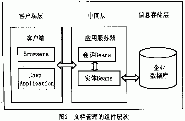 在上述J2EE 体系结构下,文档管理的组件层次如图2 所示。在文档管理模块的编程中,主要使用两个会话Bean ,其中第一个会话Bean 用于访问若干实体Beans (根据文件类型的不同,每个实体对应一个不同的表格) 。通过文件的类型来增加或修改数据库不同表格中的记录,实现诸如文件的签入、签出、复制等操作的数据库记录属性值的改变;第二个会话Bean 用于访问系统管理模块的有关实体Beans ,通过查找工作空间、电子空间等表格,实现文件实际物理存储位置的变化。