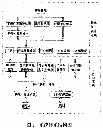 PDM作为一门管理所有与产品相关的信息和过程的技术, 为产品快速组合设计系统提供了必要的支持环境。PDM系统基于计算机网络和数据库, 将以往存放在不同计算机的不同目录下由各种应用软件生成的文件, 转化为存放在服务器数据库里的记录, 并有效地管理起来, 提供强大的查询和统计、报表等功能, 保证各种文件的安全性。PDM系统将所有与产品相关的信息和产品的开发过程集成起来, 创造出一种透明度很高的虚拟环境, 能适应复杂多变的变型设计的需求, 保证在整个产品生命周期中使产品数据具有一致性定义的条件下, 进行产品设计的数据管理和过程管理, 是集成计算机辅助工具CAX 的重要武器,成为能支持基于产品模型的快速组合设计的数据平台。