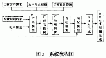基于系统的主要功能, 系统的体系结构简图如图1 所示。系统的工作流程是: 分析已有的客户需求, 并对潜在的客户需求进行预测, 结合企业已有的设计资源, 对产品有全局性的把握后,划分产品的功能模块, 进行产品模型的设计。客户从产品模型中配置结束后, 根据产品的功能树获得产品的结构树, 把结构树中涉及到的零部件图形输入到三维CAD 系统中进行自动装配, 形成产品的装配模型, 对产品模型进行各种测试,把装配模型和测试结果反馈给客户, 使客户在产品制造前就能充分地了解产品的外观、结构、性能等, 如果客户对产品不满意, 根据客户提出的修改意见进行修改, 可以在产品的装配模型上进行修改, 修改结果将反映的产品结构中, 也可以修改产品结构, 重新生成产品的装配模型, 直到客户对产品满意为止。根据各个部门对产品结构的不同需求生成不同的产品结构视图, 供相应部门使用。如生产部门关心的是零件的生产和部件的装配过程, 采购部门只关心产品结构中的标准件和外购件等。系统流程图如图2 所示。