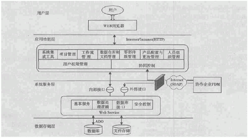 在经济全球化的今天,项目小组可以分散在世界各地,如何协同他们之间的关系,通过有效的通讯机制实现产品的协同设计是必须要解决的问题。传统的PDM在构架上主要是基于C/S 的两层结构,也有三层的结构,对于三层一般采用DCOM 或CORBA 技术,但这两种技术不能满足跨平台的环境要求,使得传统的PDM 无法在跨平台异构环境下工作。