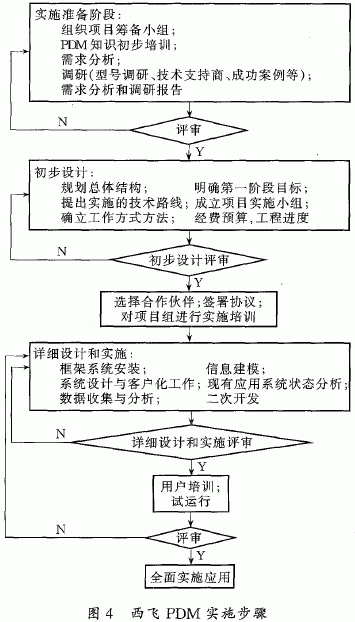 通常,PDM系统实施包括组建队伍、需求分析、系统设计、详细设计、二次开发、安装与装置、人员培训以及试运行等步骤。根据实际情况,这些步骤也可以有所变动。图4简要地描述了西飞的PDM实施步骤。
