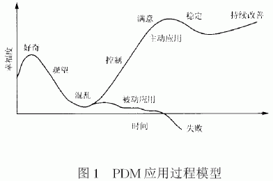 传统产品开发由于行为及过程的随意性和数据的不规范,整体效率不高。PDM体现了先进的产品开发管理模式,代表着一种新的管理理念和企业文化,不仅重视产品开发局部效率,更强调整体效率的提升。PDM实施是企业实现产品数据、业务流程及行为规范化和制度完备化的过程,如图1所示。在应用初期,由于对系统认识不够,加上供应商的宣传,企业人员对PDM应用往往具有较高的幸福度,而对其实施难度认识不足。随着实施的深入,业务模式的变化及系统使用的不熟练,导致局部工作效率降低,应用人员抵触情绪膨胀。此时各级领导必须积极参与,做好业务规划,加强控制,避免系统应用的失败。随着工作的继续推进,PDM应用渐渐进入稳定状态,设计人员逐步由被动使用转化为主动应用。随着时间的推移,由于企业需求的发展变化,系统应用还会出现细微的调整。