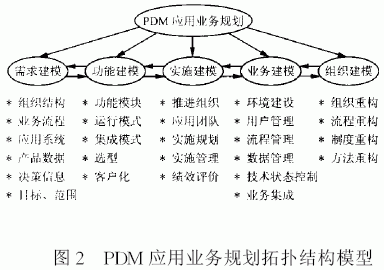 实施建模是PDM成功应用的重要保证,包括项目组织建立和推进模式规划。前者涉及项目推进组织及系统应用团队建设两个层次,后者涉及以下几个主要方面:(1)项目管理机制,如问题解决机制、项目跟踪机制、风险控制机制的建立等;(2)项目监督机制,如项目监理的选择;(3)项目推进模式,如项目阶段划分、试点部门、试点项目及试点产品选择、培训及投入规划;(4)项目评价机制,包括评价制度、评价组织和评价指标。