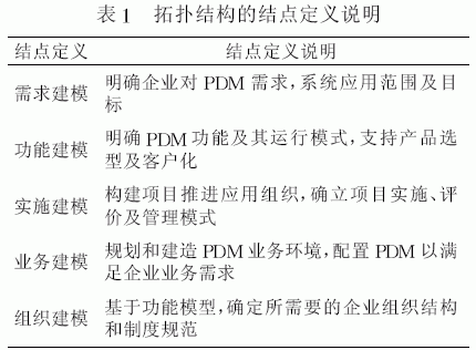 PDM应用是按企业业务过程模型确定PDM方案,并按系统方案配置业务环境的过程。对于成熟系统,业务规划的主要内容是明确系统方案,规划和建造PDM业务环境,配置PDM以满足企业业务需求。PDM应用业务规划离不开企业信息化整体规划,本文基于大型PDM应用,提出了如图2所示的业务规划拓扑结构模型,各阶段之间具有反馈修正的循环关系,互为补充和支撑,共同表达企业形态,表1为结点定义说明。