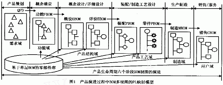 在产品生命周期中,由于新产品的功能、性能、几何形态、质量、成本和零部件配置等结构和属性的形成,是一个从无到有、从粗到细的优化迭代过程。因此,表征产品结构的物料清单(Bill of Material,BOM) ,在生命周期的不同阶段也是一个逐步形成与演进的过程。面对激烈的市场竞争和顾客的个性化需求,许多制造企业对产品结构与配置信息仍采用落后的人工管理方式,造成产品生命周期中各阶段BOM 结构数据的表达不一致,导致设计、工艺、生产、销售过程中的产品、零部件和原材料在设计、供应、装配、销售和维修等各个环节上的差错,影响企业的市场竞争力。