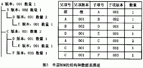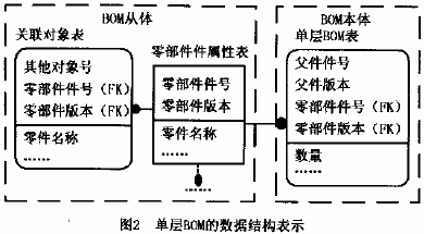 采用单层BOM 来描述基本零部件结构视图的优点如下: ①可方便更改BOM 的配置。一个零件或部件被更改,其他引用该零件或部件的地方也被更改了(因为单层BOM 中相同的零部件隶属关系只记录一次) ,且数据冗余少。②单层BOM 中的零部件,最顶层父项只能是部件,因此,单层是与产品无关的基本零部件结构配置。当某个零件或部件被某个产品引用时,单层BOM 中的零部件及所关联的属性信息才与具体的产品发生联系。基于单层BOM 的管理思想,可将企业所设计的成熟的所有零部件按单层BOM 方式构造成基本零部件库,作为产品配置设计的基础。由此可配置出基于共用件管理模式的产品配置,把过去以产品为对象的BOM人工管理方式提升为以零部件为核心的BOM 管理方式,配合零部件独立编码的使用,避免借用件在产品BOM 中出现,解决了长期以来产品BOM 人工管理中对借用件管理的混乱状况。