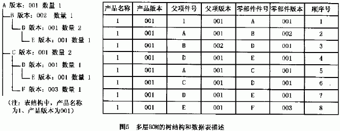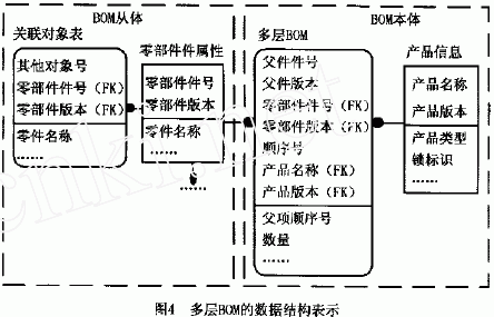 单层BOM的描述零部件的配置关系时,只记录父项/子项间的两层隶属关系,若用它来描述一个完整产品的零部件配置关系,就需要根据零部件间的父项/子项两层隶属关系。自顶向下逐个关联所有的零部件,再生成产品的完整BOM结构,需花费较多时间。因此,为了记录和快速表示一个完整产品的BOM,我们构造了一种多层BOM的表示方法。其特征是详尽地记录了从产品到零部件的每个层次结构与零部件配置关系,即同一产品的相同零部件结构在该BOM的不同层次上可重复出现,以完整地记录一个产品的所有零部件配置关系,其数据结构如图4所示。