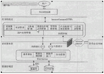 在经济全球化的今天,项目小组可以分散在世界各地,如何协同他们之间的关系,通过有效的通讯机制实现产品的协同设计是必须要解决的问题。传统的PDM在构架上主要是基于C/S 的两层结构,也有三层的结构,对于三层一般采用DCOM 或CORBA 技术,但这两种技术不能满足跨平台的环境要求,使得传统的PDM无法在跨平台异构环境下工作。