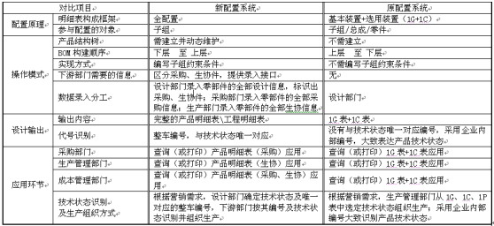 由于存在大量的历史数据不可能短时间完成格式转换,在PLM系统中的产品BOM会有相当长的一段时间G/C/P表的形式与全配置BOM的形式并存,另外加之PLM系统配置功能的灵活性,如果对BOM和配置进行彻底的整理和再造将产生巨大的工作量和出错的可能性以及冲击所有与配置相关人员的观念和习惯。因此对于产品配置功能推广公司制定了科学的推广策略a)试点阶段:选择了一个开发周期长的项目,零部件基本是全新开发,目前仅完成一个设计整车BOM数据的录入且已完成产品配置标准的定义;且可能变型设计BOM数据达10多个左右,另外该项目组成员对国外PLM配置概念的理解较深,较长的开发周期为PLM产品配置功能验证及与下游生产部门数据传递方式的确定提供了时间保证。b)全面推广阶段:全新产品按照开发计划,按季度排定计划全面实施全配置方式;历史数据整理以生产量大的、更改频繁的车型做起,并成立工作组集中进行