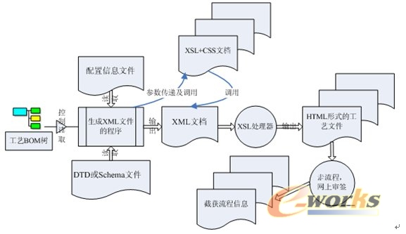 本文主要介绍和阐述的内容是:以PLM环境下的工艺BOM树为研究对象,运用Java语言将产品的工艺BOM信息以XML文件形式输出,并运用XSLT技术转化为基于WEB的工艺文件,利用了WEB技术支持多任务与多用户的并行和异地协同工作,最后在电子工艺设计编制完成后,输出整本工艺规程(图1虚线圈着的部分),可以网上传输和协同浏览(即在协同设计时实现“你见即我见”方式的浏览功能)及网上审签。