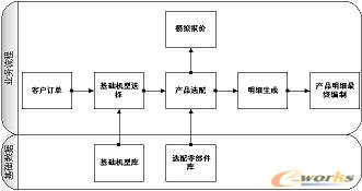 产品选配器是基于PDM系统的功能扩展,因此集成了PDM系统强大的明细及构件管理功能,通过基础机型及选配零部件选配库定义,可实现明细表的自动生成功能,开发工程师可直接对该明细表进行编制,最终形成产品明细,并通过与ERP接口技术,可实现自动生成产品报价。产品选配器从商务谈判开始介入,由订单中客户基本要求自动转换为基础机型,客户或销售人员可直接在选配器上根据客户个性化要求,在基础机型配置的基础上,对某些零件或功能进行选择,最终生成产品初步明细表。选配流程图如下: