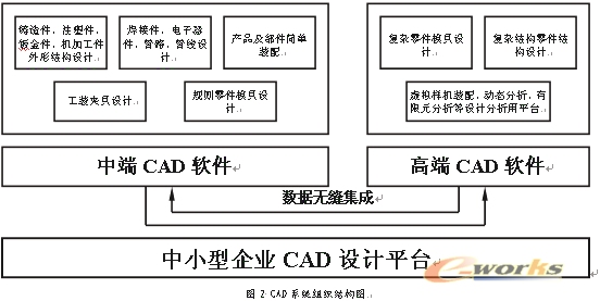 中小型制造业企业规模小,资源少,决定了其建设信息化的能力有限。如采用完全的高端三维设计软件略显大材小用,容易造成投入和产出的不平衡。对于CAD软件的选型,中、高端软件相结合、以中端软件为主、高端软件为辅的使用方法是最适合中小型制造业企业的一种CAD设计系统搭建方案,中端CAD软件作为新产品的主要建模工具,高端CAD软件作为新产品的虚拟样机装配、动态分析、有限元分析等设计分析用平台和高级曲面功能建模。