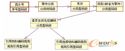 为了建立编码系统,首先需要根据编码系统的编号规则确定编码包含了哪些部分(这里统一称为码段);码段的类型:是固定值,还是分类型选择、日期型、帐户型、输入型、脚本型、流水号等;码段与码段之间的关联关系,按照关联关系确定的顺序先后排列各码段。按照上述信息在统一编码系统中根据上海机床厂的物料编码系统分别建立了机械零件、部件、毛坯件等的物料规则,类似下图所示: