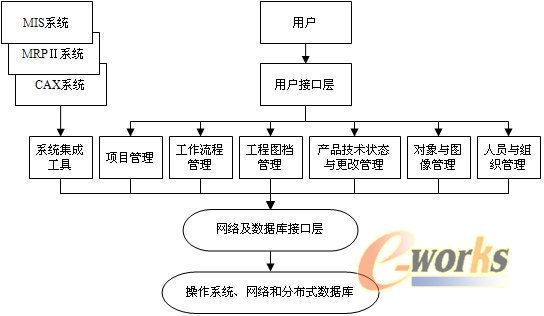 PDM系统可以集成并管理与产品有关的信息、过程、人员和组织,包括四个层次,即图纸文档的电子化管理层次、部门级的数据管理层次、企业级的数据管理层次和企业间(可能是行业级,也可能不是行业级)的数据管理层次。从我国制造企业的组织结构特点看,企业间的数据管理是面向行业推行PDM技术及其应用系统的关键问题之一。基于Corba和Web平台的PDM系统以整个企业为一体,跨越所有工程技术群体,是促使产品快速开发和业务过程快速转化的“催化剂”,也是在分布式企业管理模式基础上,与其他应用软件系统直接联系的核心环节。一般来说,PDM原型系统以网络环境下的分布式数据处理技术为支撑,采用客户机/服务器和Internet/Intranet体系结构以及面向对象的设计方法,在企业级实现产品全寿命周期的信息管理,协调、控制工作流程和项目进展,从而在整个企业范围内建立一个并行化的产品开发与协作环境。基于PDM原型系统的体系结构如图2所示,包括项目管理、工作流程管理、工程图档管理、产品技术状态与更改管理、对象与图像管理,以及系统集成工具等基本功能。