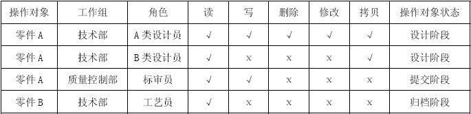 在企业中,不同岗位的人员对产品数据可以实施不同的操作,为此需对角色及其所赋予的操作权限进行有效管理,建立角色-操作权限表。