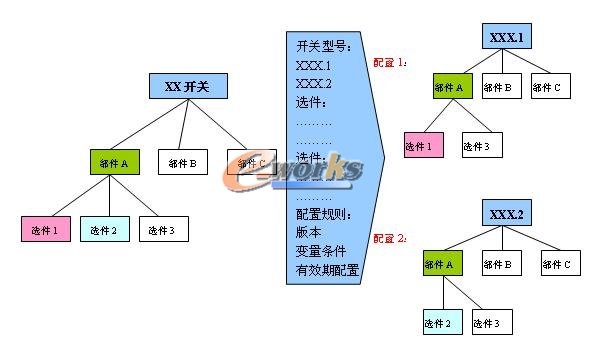 PDM/PLM(TcEng)的产品结构是一个动态的通用产品结构,该产品结构的原型可以直接来源于设计人员在CAD中建立的装配结构,也可以用PDM/PLM(TcEng)的产品结构管理模块,通过编辑搭配数据库中现有的零部件形成。利用PDM/PLM(TcEng)产品结构管理模中的版本配置、变量配置和有效期配置功能,在通用产品结构的基础上,通过设置不同的条件,可以使一个通用产品结构演变成多个实际的产品结构,如下图所示。