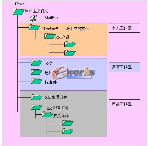产品创新设计过程中产生的全部数据、文件、标准等参考资料和质量管理文件,可供所有相关人员共享。PDM/PLM(TcEng)系统采用结构化的文档组织形式,其目的是使产品对象信息组织结构化、规范化,包括个人工作区、共享工作区和产品(项目)工作区三部分,如下图所示: