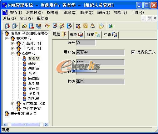 由于PDM系统管理的产品数据经过多个阶段,被不同部门、不同人员访问和操作,具有不同的版本状态。人员组织管理模型也称为组织—角色—权限模型,是对企业的人员组织方式、角色分配以及操作权限设置的描述,实现产品数据被适当的人在允许的权限范围内进行有效的访问,确保产品数据管理的安全性和保密性。图文档审核入库后PDM系统按照本企业规范对文档的查询浏览、提档、归档、复制进行有效管理,并通过权限设置,限制各级人员对图档的共享权利,达到安全管理目的。图2为在 KMPDM中建立人员组织—角色—权限图。