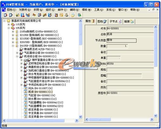 通常使用产品结构树的方式表示产品零组件之间的层次与隶属关系。可以对产品结构树进行任何层次的展开,树中的节点表示部件或组件,叶节点则表示零件;产品结构树上的节点有属性,可对结构树上的节点通过关系进行查询,比如零部件的名称、材料、质量、类型(外购件、自制件)等,还可以对任意设定层次的BOM表进行输出。通过电子仓库,使描述零部件的文件信息与节点上的相数据进行管理,形成完整的产品结构化信息树。有了产品结构树,管理者即可分层展开走不同分支的方法直观地找到自己所需的数据,而不必考虑其物理位置。产品结构管理的表现形式是产品结构树,产品结构树是产品的虚拟体,也即是产品结构的视图。建立产品结构树,设置“系列→机型→结合组→结合部→结合件→零件”六级树型目录,使电子图档与产品之间建立对应关系,便于直接浏览相应科目。通过图纸导入自动生成与交互式两种方式建立图3所示产品结构树模型。