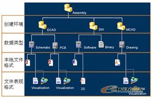 为满足技术状态管理的要求,根据产品或系统的功能特性和物理特性,进行产品结构的层次规划,建立包括标准件、耗材、对称右件等在内的完整产品结构。从产品结构的创建环境和数据类型的角度来看,如下图所示,一个复杂产品或系统的产品结构包括由机械CAD、电子CAD、软件开发工具等创建的所有结构化的数据。