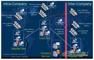 4) Teamcenter Engineering提供了多站点协同技术,如下图所示,可以实现与遍布全球的其它业务实体、合作伙伴、供应商等实现虚拟企业级的技术状态管理和协同。