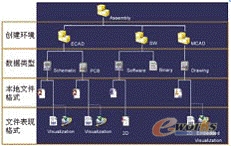 为满足技术状态管理的要求,根据产品或系统的功能特性和物理特性,进行产品结构的层次规划,建立包括标准件、耗材、对称右件等在内的完整产品结构。从产品结构的创建环境和数据类型的角度来看,如下图所示,一个复杂产品或系统的产品结构包括由机械CAD、电子CAD、软件开发工具等创建的所有结构化的数据。