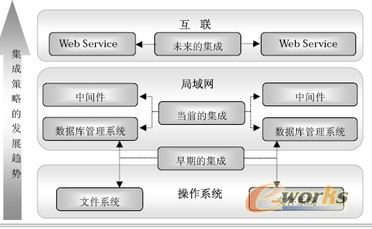 当前的信息系统在实现上趋向网络化,基于Web的方案也已经成为企业客户的首选,可以预见在不远的将来,集成策略将会从现在的基于数据库的集成向着更高层次发展。从技术发展的趋势看,基于XML Web Service,由于直接采用广域网上的高层协议,避免了大量异构系统之间的不一致性带来的问题,非常适合未来企业在广域网环境下的集成。如果采用Web Service进行集成,企业只需要在内部的Web服务器上部署用于集成的Web Service接口,而集成的过程则是通过信息系统之间互相调用WebService完成。这样的集成不但可以在企业内部进行,也可以在企业之间通过广域网进行,有利于企业的信息化业务扩展。