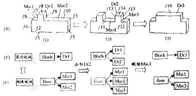 下面以图6所示的零件说明上述算法过程。图中(1)所示的零件,从设计视域看,有一个基本块体Block(含面f1,f2,f3,f4,f5,f6,f10)和肋Dr1(含面f2,f3,f7,f8,f9);从制造视域看,有一个毛坯体Base(含面f1,f2,f3,f4,f5,f8),两个台阶Mst1 (含面f6,f7)和Mst2(含面f9, f10)。当在设计中添加一个肋Dr2后,改变的面组是<f10~f15>,查询特征关系图可知加工特征Mst2发生改变(由于f10被删除,Mst2也被删除),这时根据面组< f9,f11~f15>各面的凸凹连结关系进行几何推理,识别出制造特征槽Mso1(含面f9,f11,f13)和台阶Mst3(含面f12,f15)。制造视中的特征改变向设计视传播的算法与前面类似,如图6中的零件(2),在制造视中删除槽Mso1,面组<f9,f11,f13>被删除,查询特征关系图可知设计特征Dr1,Dr2将发生改变,这时根据面组<f2,f3,f7,f16,f15>各面的凸凹连结关系进行几何推理,与设计视域的特征相匹配,识别出设计特征槽Dr3(含面f2,f3,f7,f16,f15)。图6给出了上述两个例子的特征的变化,图6a显示了零件形状的变化,图6b显示设计特征树的变化,图6c显示制造特征树的变化。当然在实际使用中,特征的改变是否合理,应由用户根据设计要求作出判断。