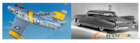 我们把F-86战斗机的尾部和卡迪拉克轿车的尾灯作一个对比,大家马上会发现其中的相似之处:
