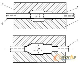 在汽车零件的加工中,根据有无轴向进给,可以把管件液压柔性成形分为两类,一类为有轴向进给,如图1 所示,主要用来成形壁厚均匀或较大成形量的零件;另一类为无轴向进给,主要用来零件的整形和多个零件的胀接如中空凸轮轴的生产等,对于轴线为曲线的零件,还需要把管坯预弯成接近零件形状,然后加压成形, 如图2 所示。