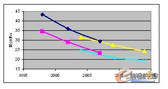 1998年Delphi OSAT(The Office for the Study of Automotive Transportation)的一项研究表明,全新平台的新车投产所需平均时间为44个月,并且预测到2008年可能会缩减到29个月; 而2005年Delphi CAR(The Center for Automotive Research)研究表明到2015年全新车型的开发到投产的平均时间将会缩短到24个月,基于现有平台的开发时间亦会相应缩减。