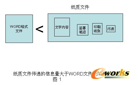 电子文件的组成究竟是什么?一般我们认为电子文件就是文件的数字载体形式(如WORD格式文件、AUTOCAD格式图纸等)。但经过研究我们发现数字格式文件所承载的信息量实际上是小于纸张载体形式所承载的信息量。(如图1)。
