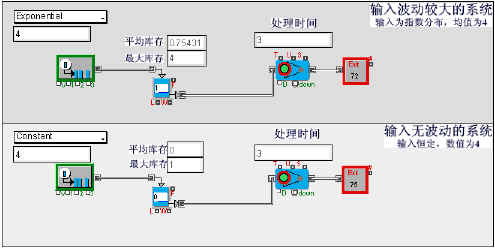举一个很简单的例子,是我们用计算机仿真的方法模拟一个生产线投料的过程。二组完全相同的生产系统,唯一不同的就是投料的节奏不同。上一组投料有快有慢,下一组保持固定的节奏,但二组的投料间隔的平均值都是相同。运行这两组生产线,会发现固定节奏的生产线不需要保有库存,因为投料速度没有机器处理速度快;而同样的系统,投料有快有慢的生产线上,在制库存就已经攀升,差别非常明显。这是一个典型“以库存为代价弥补变动影响”的例子。