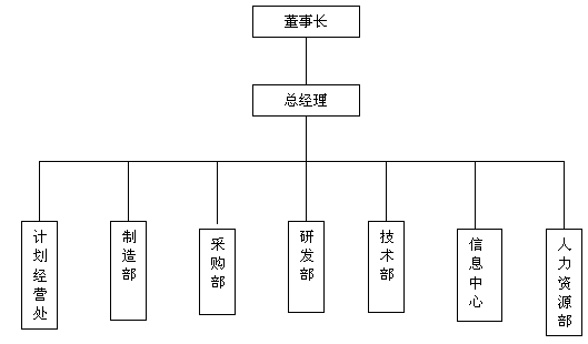 图1的的流程简单概述如下:客户下订单给企业的销售部门,销售部门与客户确认定单,定单确定后销售部门首先查看成品仓库,如果成品库中的数量可以满足客户的订货需求,就直接发货给客户,行成应收款,销售过程基本完成。如果成品库存不能满足客户订单,销售部门会把订单下放到生产管理部门,生产管理部门负责做主生产计划,经过粗能力审核,形成MRP,MRP生成采购计划和自制计划,采购计划下放到采购部,采购部选择合适的供应商,供应商提供原材料进入原材料库;自制计划经过细能力审核,进入车间任务系统,车间任务经过合理调节,进入车间作业系统,车间作业安排生产,进行能力调整,最后生成成品,经过质量检验,成品入库。同时,在采购部形成应付款,在销售部形成应收款,应收与应付自动分录,进入总帐系统。 下面所讲的是在各环节所要提问的内容: 基础数据:基础数据是实施ERP最基础最关键的环节,人们常说ERP项目成功的关键是三分技术,七分管理,十二分数据,基础数据的重要性可见一斑,基础数据主要包括:产品以及原料的物料编码,BOM表的数据,产品的工艺路线,工作中心的能力等。调研者可以从下面几个主要方面入手:1,物料编码有什么样的物殊性?有的企业物料编码很长,有的企业物料编码字母与数字并存,有的企业物料编码要有颜色与尺寸方面的要求,行业不同,有不同的编码要求,调研者进行调研前最好有所了解。2,企业的BOM是怎么设计的,由哪个部门制定,BOM是不是经常改变,最好让企业提供一份正在使用的产品BOM的样本。3,工艺路线是生产中的加工、装配过程的顺序的描述,调研者要了解是工艺路线是不是经常改变,有多少个工艺路线,多少产品共用一个工艺路线。4,工作中心方面,调研者需要了解企业是按照什么来划分的?是按设备还是按人员来划分的。 销售管理:销售管理所要了解的内容如下:1,企业大概有多少客户?是以内销为主,还是外销为主?其中固定客户以及比较重要的客户占多大比重?2,客户的地理位置如何分步?3,需要哪些销售分析和报表?4,如果有分公司并且分步在不同地区的话,是不是要求实时查询各公司的销售情况? 库存管理:库存管理一般要了解下面的内容:1,有多少仓库?是不是多地点?2,库存积压多不多?大概点多少资金?3,有没有安全库存?库存之间调拨货物多不多?4,成品或者原料库存是按什么管理的,是不是ABC分类法?或者是其他方法? 生产管理:生产管理包括很多内容,有生产计划,车间任务,车间作业等,调研者可以从以下几个方面了解需求:1,是按什么方式生产?是按订单,还是按库存,是多品种少批量,还是流水线生产。2,有多少车间?有多少生产线?3,外协加工多不多?很多产品是不是交叉作业?4,主生产计划是不是经常经常调整?生成计划时要考虑哪些因素?5,生产周期有多长? 采购管理:采购管理部分需要了解如下情况:1,有多少供应商?选择供应商的标准是什么?要不要对供应商进行信誉度的审核?2,怎么样进行质量检查?不合格采购品是怎么退货的?3,有没对采购过程进行跟踪的要求? 财务管理:需要了解的内容如下:1,要不要系统与银行对帐,对帐依据是什么?2,财务报表是用什么样的标准,有没有特殊的要求?3,企业是怎么样进行财务分析和财务预算的?4,目前有没有使用财务软件,是不是要和其他模块进行数据交换?5,分公司是不是独立财务核算? 组织结构分析法是根据公司的组织机构从上到下提问需求,企业组织结构有三种方式:职能型、项目型和矩阵型,一般的制造型企业采用的是职能型的组织结构方式,这种方式最高一层是董事会以及总经理,向下根据工厂的需要,分成具有不同权限、管辖范围的职能部门。 下面是一家公司的组织机构:图3