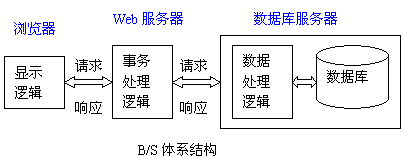 使用于C/S地功能应具有以下特点: i) 安全性要求高; ii) 具有较强的交互性 iii) 使用者活动范围相对固定; iv) 要求处理大量的实时数据。 2、 基于B/S: 本质上B/S也是一种C/S,它是由传统的二层C/S结构发展而来的三层C/S结构在web上的应用,即浏览器/Web/数据库服务器结构的三层结构。三层的B/S体系结构是把二层的C/S结构的客户事务处理模块从客户机的任务中分离出来,由单独的一层来负担其任务,把负荷均衡的分配给了Web服务器,这样给客户机的压力大大减轻了,于是原来两层的c/S变成了三层的B/S结构,这种三层体系结构如下图: