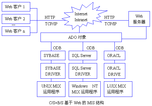 使用B/S模式的功能模块应具有以下特点: i) 使用者活动范围变化大; ii) 安全性要求相对较低; iii) 功能变动频繁。 与C/S相比,采用B/S的好处是: 1) C/S的开发成本较高,对不同的用户要开发不同的应用程序,编程工作量大。B/S只需在客户端安装通用的浏览器,在服务器方面,应用可为IntE-Rnet/Intranet上的任何授权用户所使用,所以B/S的开发成本较低; 2) C/S的客户端具有显示和树立数据的功能,客户端负载大;B/S的客户端把事务逻辑部分分给了功能服务器,大大减轻了客户端的负载; 3) C/S采用内部标准,通常是专用的;而B/S采用开发的,非专用的标准,保证了其应用的通用性和跨平台性。 4) C/S系统中每一部分的变动都关系到其他模块的变动,灵活性差;而B/S的灵活性更好,其层与层之间相互独立,任何一层的改变不影响其他层的功能,系统改进变得非常容易,而且可以用不同厂家的产品来组成性能更好的系统; 5) C/S系统的客户机直接和数据库相连,安全性较差;而B/S在客户机和数据库服务器之间加了一层web服务器,使两者不在直接连接,客户机无法直接对数据库操纵,可有效的防止非法用户的入侵,增加了安全性; 6) C/S移植困难,而对B/S由于客户端装的是通用浏览器,不存在移植问题。 7) B/S的用户界面不像C/S一样由客户端所装软件决定,而是使用通用的浏览器,更方便用户使用。 3、 基于B/S、C/S的混合模式: 通过比较发现,B/S具有许多C/S说没有的优点,但是由于目前的B/S开发工具还不够成熟,所以B/S得成本相对要高。对于企业的B/S应用,从当前技术水平看,特别适用于系统统用户交互量不大的应用,对于要求高速、频繁交互的模式则采用C/S体系,所以两者的应用时相互补充的。这种混合模式是企业应用最大的模式,其基于Web的管理信息体系流程图如下: