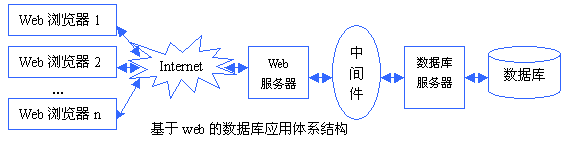 如图所示,这种管理体系是基于网络的、分布式的、异构的管理信息系统,这种体系可以容纳不同地域、不同网络结构类型、采用不同数据库和应用程序开发工具、在功能上相对独立的管理信息系统、各种管理信息系统通过web服务器,在客户端以浏览器方式访问,实现系统之间的信息共享。 4、 基于web: IntERnet地主要资源便是web。Web是以http或ftp协议为基础形成的信息网络。从硬件的角度而言,一个web系统的组成是:web服务器、计算机网络和多个web客户机;从软件的角度看,web的组成是:web服务器软件、TCP/IP协议和Web浏览软件。 Web系统的基础模式是三层体系结构的B/S。第一层是用浏览器完成用户的接口功能;第二层由各种服务器完成用户所需的服务功能;第三层有由数据服务器完成数据存储和管理功能。基于web访问数据库的应用通常包含以下4部分的内容:web服务器、web浏览器、数据库服务器、中间件(如路由器,集线器等),其体系结构如下图: