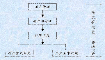 "用户管理"、" 用户组管理"、" 权限设定"作业,须由系统管理员执行;普通用户只能使用"用户菜单设定"和"用户密码变更"程序。系统管理员对用户组或用户分配其使用权限,可按用户组/用户、或模块、或程序进行用户权限分配