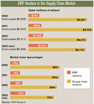 | ERP巨头进军物流产业 | 发表时间:2003-9-22 特约撰稿人: 沈立 来源:投稿 | 关键字:物流 | | | | 当你在考虑谁将是物流或供应链管理方面最好的软件提供商时,你首先想到的将不会是SAP,ORACLE或J.D.EDWARDS。虽然,在几年前曾经有许多专家预言这些大型的ERP供应商将会成为最大的物流与供应链管理软件方面的提供商。 随着EPR系统市场的逐渐饱和,大型ERP软件提供商们很自然地将目光投向了供应链方面的市场,他们认为这是其原有市场的自然延伸。需要指出的是,他们的渗透方向是仓储管理系统和运输管理系统。而且,即使在制造业分析方面,ERP厂商们也比MANHATTAN和EXE的仓储管理系统生产商、GLOG和REDPRAIRIE的运输管理系统生产商落后了几年。但我们不得不承认ERP生产商门正在努力追赶着,确实很快,以至于FORRESTER预言到2008年大部分的供应链市场将属于SAP,ORACLE,IBM,和微软。 我们可以从AMR调查公司分析图表上清楚地看到,近几年ERP厂商们无论在销售额还是市场占有率方面都保持着强劲的上升势头,他们是否真的会取代供应链软件供应商完全占领这个市场呢?