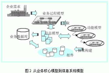 基于企业建模的信息系统战略规划就是在模型上完成从需求层的业务核心模型到设计层的信息系统模型的抽取过程,如图2所示。根据建立并优化分析好的业务核心模型,从过程模型中根据功能抽离组织出信息系统需要实现的业务功能和功能结构,并且将过程中涉及到的活动、活动之间的逻辑关系和活动之间的数据流映射成这些功能单元里面的功能操作、功能单元之间的交互关系以及整个信息系统中的数据流,这些功能单元将配置成最后运行的信息系统中的子系统或者系统组件。将过程模型中活动使用的和传递的各种可以用表单形式表达的数据抽取整理成为信息模型,描述数据结构和数据关系,同时功能单元之间交互的数据来源于这个信息模型。最后,再根据业务核心模型中描述的业务过程所关联的产品信息、组织信息和资源信息,可以确定未来数据库的系统结构、网络结构,构造信息系统各功能单元之间的集成框架。